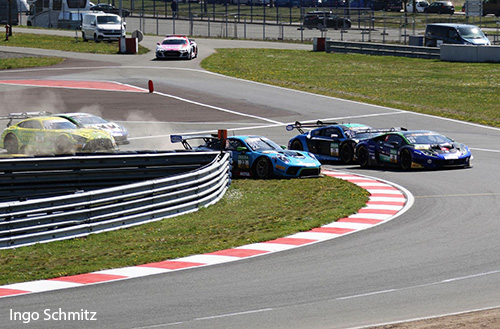 Im Samstagrennen gab es bei wunderschönem Wetter gleich zu Beginn eine haarige Szene, als Rookie Joel Sturm (nomen est omen) im Allied-Racing Porsche mit einen Bombenstart von P3 kurz sogar die Führung übernimmt. Aber dann ist die erste Kurve einfach zu früh da und er muss durch den Kies abkürzen. Bei der Rückkehr auf die Strecke kommen gefühlt tausend Schutzengel zusammen und sorgen für einen unfassbaren, berührungsfreien Fortgang. Eine geile Aktion, die zum Glück für einmal zumindest gut geht. Aber genau das möchten die rennsportbegeisterten Zuschauer sehen.